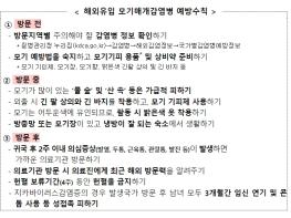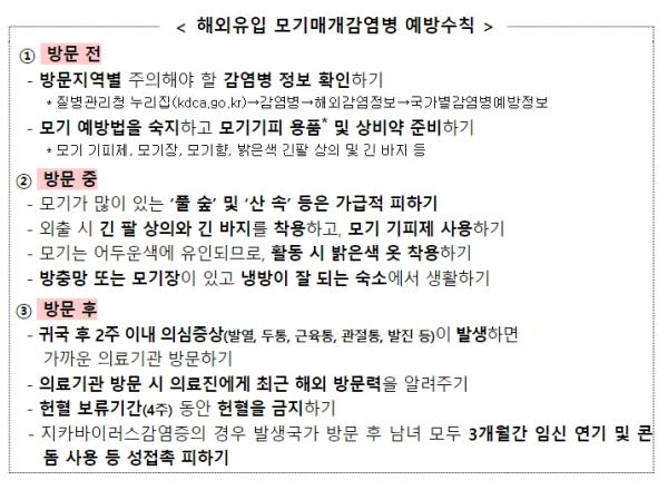 지영미 청장은 동남아 등 모기매개 감염병 발생 국가를 방문 계획하고 있는 국민에게 다음과 같이 해외유입 모기매개 감염병 예방수칙을 숙지하여 뎅기열, 치쿤구니야열 및 지카바이러스 감염증에 감염되지 않도록 각별히 주의할 것을 당부했다.