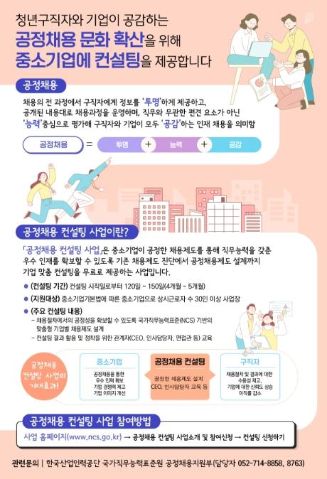 [한국뉴스타임=편집국] 고용노동부와 한국산업인력공단(이사장 어수봉)은 3.21일 ?공정채용 컨설팅? 사업을 신규 시행하고, 채용 제도에 대한 정보?체계가 부족한 중소기업 150개소를 직접 찾아가 공정채용 제도의 설계?도입을 무료로 지원한다. 참여를 희망하는 중소기업은 사업 홈페이지에 접속해 원하는 컨설팅 기관을 선택하고 신청하면 된다.