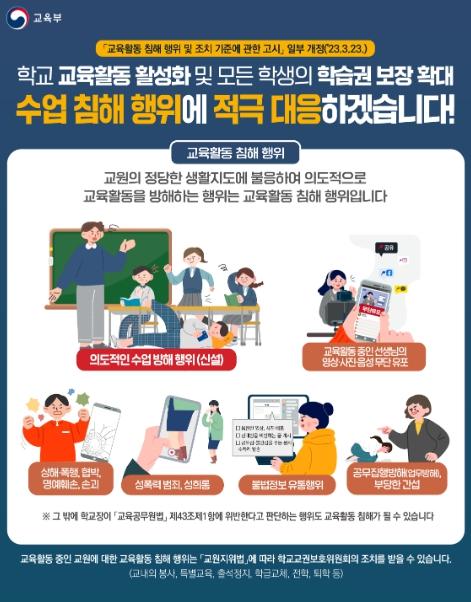 교육부는 최근 교육활동 침해 사례가 지속 발생하고 수업방해 행위도 다변화 · 복잡화되어 정상적인 교육활동을 심각하게 저해하고 있다는 현장 의견에 따라, 지난해 12월, ‘교육활동 침해 예방 및 대응 강화 방안’을 마련하고, 학교의 장뿐만 아니라 교원의 학생 생활지도 근거를 명시적으로 규정하도록 '초·중등교육법'을 개정(2022.12.27.)했다.