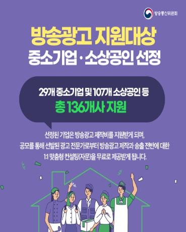 [한국뉴스타임=편집국] 방송통신위원회는 한국방송광고진흥공사(사장 이백만)와 함께 '혁신형 중소기업 방송광고 활성화 지원 사업'과 '지역밀착형 방송광고 활성화 기반구축 사업'지원 대상으로 중소기업 29개사, 소상공인 107개사를 선정했다.