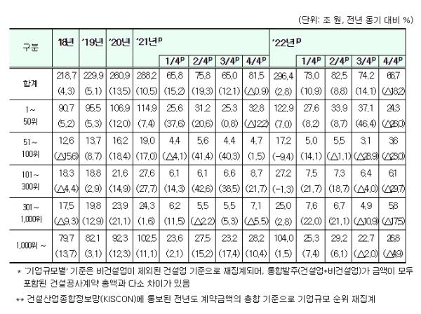 ’22.4분기 기업 순위별 계약액은 상위 1~50위 기업이 24조 3천억 원(전년 동기 대비 26.0% 감소), 51~100위 기업 3조 6천억 원(23.0% 감소), 101~300위 기업 6조 1천억 원(29.7% 감소), 301~1,000위 기업 5조 8천억 원(17.5% 감소), 그 외 기업이 26조 8천억 원(4.9% 감소)을 기록했다.