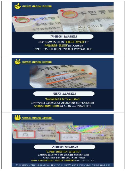 '주민등록증 모바일 확인서비스'를 통해서도 위?변조 여부를 확인할 수 있다.
