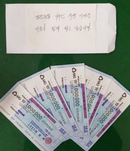 익명의 독지가가 주신 편지봉투에는 “작은 물질이지만 지역 어려운 이웃과 함께 하고 싶습니다.”라고 쓰여 진 편지와 수표 백만원권 5장이 들어있었다.