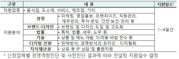 ① ‘경영안정 컨설팅’은 경영, 브랜드·디자인, 법률, 기술, 디지털 전환, 지식재산권 등 해당 분야의 애로 해소를 위해 전문 컨설턴트를 활용하여 맞춤형 컨설팅을 지원하는 사업으로 비용의 90%를 지원하며,