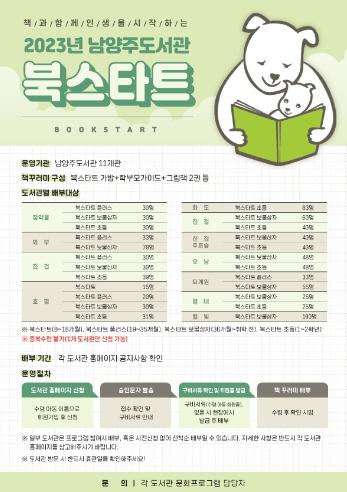 북스타트(BookStart)란 ‘책과 함께 인생을 시작하자’라는 취지의 사업으로, 남양주시 도서관에서는 북스타트 책 꾸러미 배부, 책 놀이 프로그램, 부모교육 등을 진행한다.