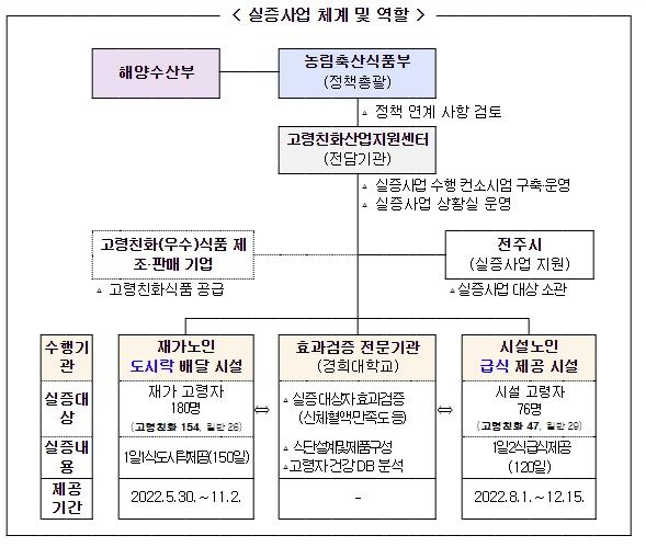 농식품부와 식품진흥원은 고령친화우수식품의 건강개선 효과를 입증하기 위해 재가노인 식사배달서비스(지역사회 통합돌봄)를 받는 65세 이상 고령자를 대상으로 고령친화식단과 일반식단을 5개월간 제공하고, 영양·건강 상태에 미치는 영향을 관찰하는 ‘고령친화식품 실증사업’을 시행했다.
