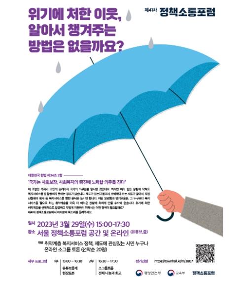 행정안전부와 교육부는 ‘위기에 처한 이웃, 알아서 챙겨주는 방법은 없을까요?’라는 주제로 3월 29일 오후 3시, 정부서울청사 별관 1층 정책소통포럼 공간에서 ‘제41차 정책소통포럼’을 공동 개최한다고 밝혔다.