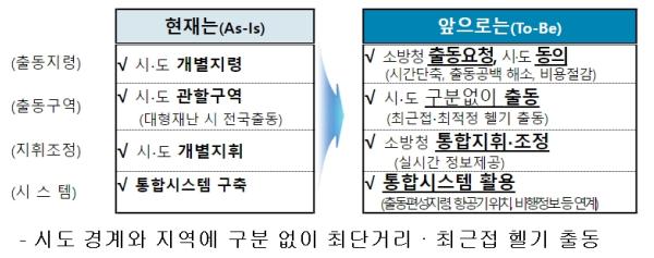 그러다 보니 일반적인 상황에서 헬기 출동 장소가 시·도 경계 지역인 경우, 현장과 인접한 관외 지역이 아닌 원거리에 있는 관내 항공대에서 출동하게 되면서 출동 시간이 오래 걸리고, 그에 따른 평균 운항시간 증가 등 헬기 운용상의 효율성이 떨어진다는 의견이 있어 왔다.