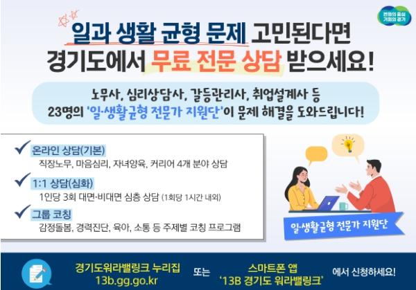 경기도는 전문 상담 서비스 지원을 위해 노무사, 심리상담사, 갈등관리사, 취업설계사 등 총 23명의 ‘일·생활 균형 전문가 지원단’을 위촉하고 노무, 심리, 육아, 경력(커리어) 4개 분야의 온라인상담과 그룹 전문 상담(코칭), 사안에 따라 심화 상담을 지원하는 1대 1 전문 상담(코칭)을 운영한다.