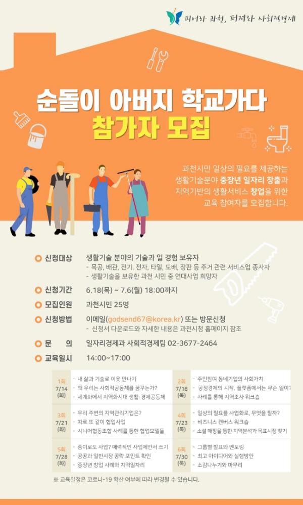 [KNT한국뉴스타임] 과천시는 주거 관련 분야의 기술을 보유한 중장년 일자리 창출과 지역 기반의 생활서비스 창업을 위한 교육 프로그램 ‘순돌이 아버지 학교가다’의 참여자를 모집한다고 23일 밝혔다.