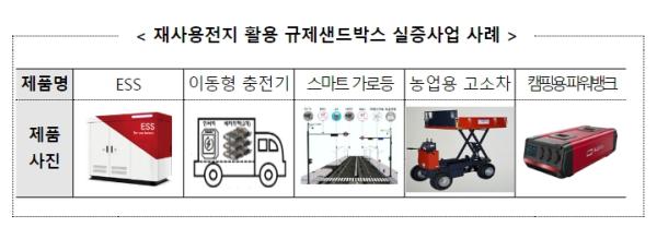 참석 기업들은 △전기저장장치(피엠그로우), △캠핑용 파워뱅크(굿바이카), △농업용 고소작업차(대륜엔지니어링), △스마트 태양광 가로등(솔루엠) 등 재사용전지를 활용한 실증사업 추진 현황과 애로점 등을 소개했으며, 이번 재사용전지 안전성 검사제도 시행으로 규제 불확실성이 해소됨에 따라 관련 사업의 활성화를 기대했다.