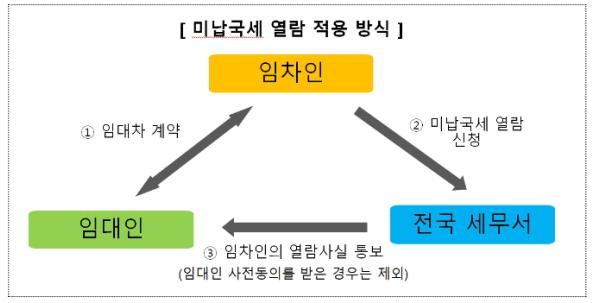 임차인은 임대차계약서 등을 지참하여 가까운 세무서(민원봉사실)를 방문하여 미납국세열람을 신청할 수 있으며 신청서 처리부서(체납징세과)에서는 관련 임대인의 미납국세내역을 조회 ? 확인하여 신청인이 열람할 수 있도록 하며, 임대인 동의 없이 열람한 건은 임차인이 열람한 사실을 임대인에게 통보하게 된다.
