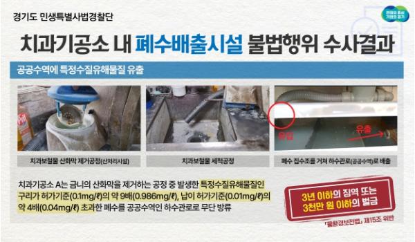 경기도 특사경은 2월 6일부터 3월 10일까지 도내 치과기공소 중 대형사업장 및 폐수 무단 방류가 의심되는 사업장을 위주로, 도 전체의 약 30%인 총 224개소를 대상으로 폐수 오염도 검사를 병행한 단속을 실시했다.