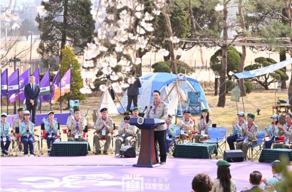 윤 대통령은 인사말을 통해 어린 시절 스카우트 활동은 큰 즐거움이자 자부심이었으며, 동료 대원들과 함께라면 뭐든 할 수 있고 더 잘할 수 있다는 자신감을 주었다고 말했다. 또, 오랜만에 항건을 매니 친구들과 야영장에서 스카우트 활동을 할 생각에 가슴이 설레 잠을 설쳤던 기억이 난다고 회고했다.