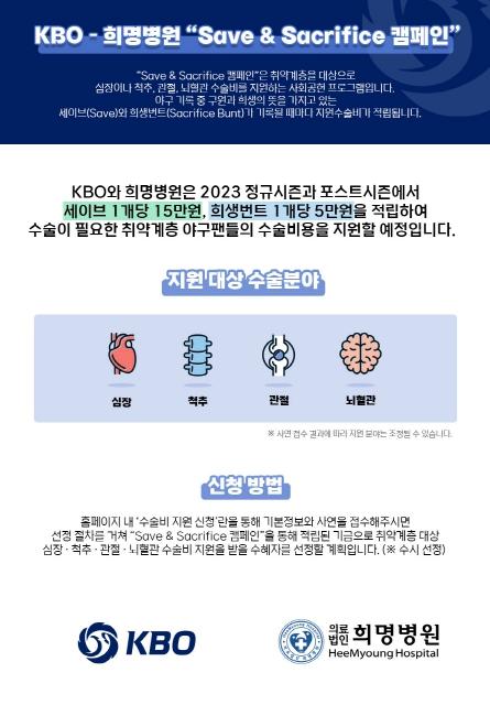 2020년부터 진행한 해당 사회공헌 프로그램은 코로나로 인해 중단됐다가 2023 시즌부터 지원 분야를 확대하여 재개된다. 의료비 지원을 원하는 야구 팬은 KBO 홈페이지 내 “Save & Sacrifice 캠페인” 안내 페이지에서 사연을 접수할 수 있으며, PC로 접속 시에만 신청이 가능하다. 해당 캠페인은 2023 시즌동안 약 10명의 수혜자를 선정할 예정이다.