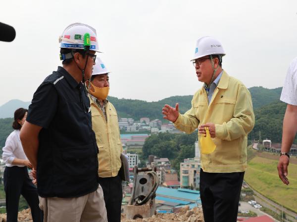 먼저, 오남읍 국지도 98호선 도로 공사 현장을 방문해 공사 구간 중 많은 비가 내릴경우 낙석 및 토사 유출 위험이 있는 절개지와 급경사지 여러 곳을 직접 올라가 배수시설과 공사현장 침수 방지 대책 등을 확인했다.