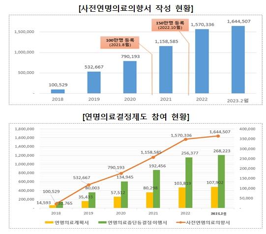 이를 통해 제도 시행 5년 만에 사전연명의료의향서를 등록한 국민은 164만 명, 임종과정에 있는 환자의 연명의료중단등 이행 건수는 26만 건이 넘어서는 등의 성과를 나타내고 있다.