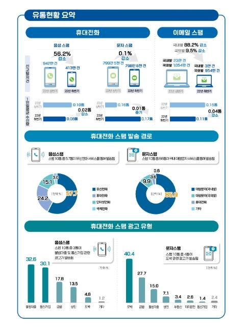이 자료는 2022년 하반기(7월1일∼12월 31일)에 휴대폰 음성·문자, 이메일로 수신된 스팸 신고·탐지건과 이용자 수신량, 이동통신사 차단율을 조사한 결과이다.