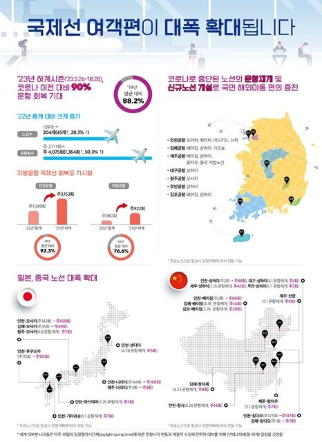 코로나-19 이후로 운항이 중단됐던 인천-프라하, 인천-취리히, 인천- 마드리드, 김해-가오슝의 운항이 재개되고, 인천-뉴왁, 김포-베이징(다싱) 노선이 신규로 취항하여 국민들의 선택권이 확대된다.