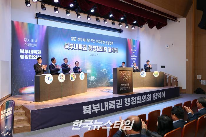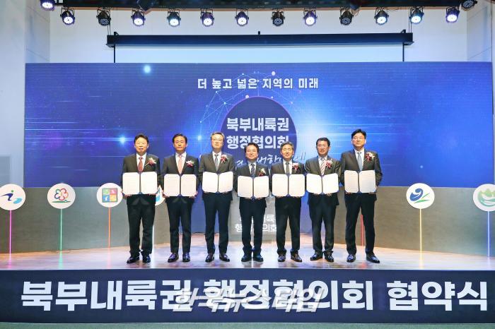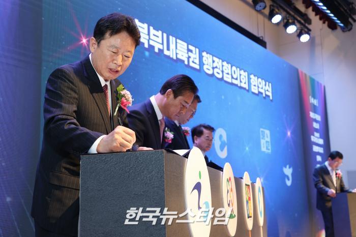 3일 경기도 서태원 가평군수, 강원도 육동한 춘천시장, 신영재 홍천군수, 서흥원 양구군수, 박경우 철원부군수, 최명수 화천부군수, 배상요 인제부군수는 춘천시청 대회의실에서 ‘북부내륙권 행정협의회’ 구성 협약을 체결했다.
