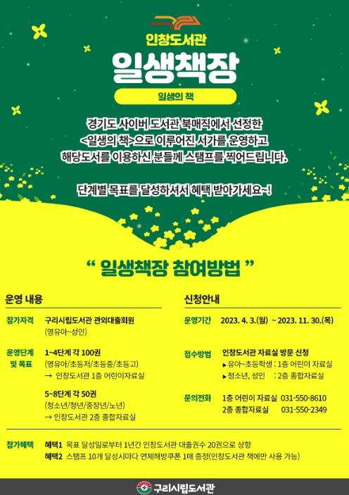 이번 프로그램의 참가대상은 구리시립도서관 관외대출회원이며, 참가자에게는 개인별 스탬프북이 제공된다. 선정된 도서(일생책)를 대출 시 1권당 1개의 스탬프를 찍어주며, 10개 스탬프 달성 시 연체해방쿠폰을 제공하는 등 단계별 다양한 혜택을 마련해 참여의 즐거움과 성취감도 느낄 수 있다.