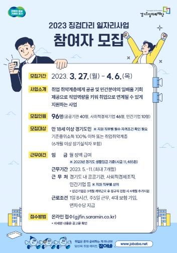 [한국뉴스타임=편집국] 경기도와 경기도일자리재단은 취업 취약계층 등을 위한 경력 형성형 일자리 창출 지원사업인 ‘2023년 징검다리 일자리 사업’에 참여할 구직자를 모집한다.