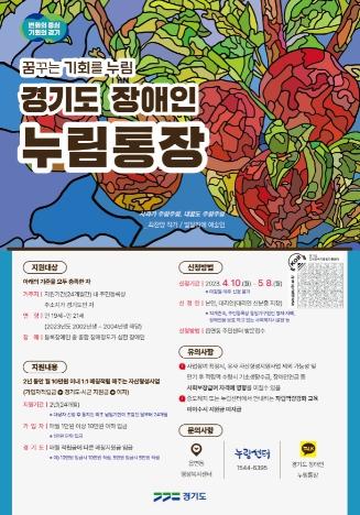 한편 이번 누림통장 홍보 포스터에 삽화를 제공한 발달장애인 미술가인 최찬양 작가는 ‘경기도 누림통장’이 매월 적은 금액이라도 저축을 통해 꿈도 키워가는 기회가 될 수 있다는 의미에서 작품명을 ‘사과가 주렁주렁, 내 꿈도 주렁주렁’으로 정했다고 전했다.