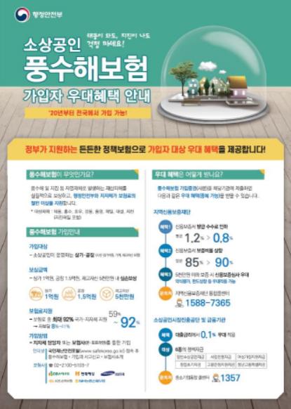 소상공인 풍수해보험은 보험가입자가 부담해야 하는 보험료의 일부를 국가와 지자체에서 최소 59%에서 최대 92%까지 지원해 저렴한 보험료로 예기치 못한 풍수해(태풍, 홍수, 강풍, 풍랑, 대설, 지진 등)에 스스로 대처할 수 있도록 돕기 위한 제도이다.