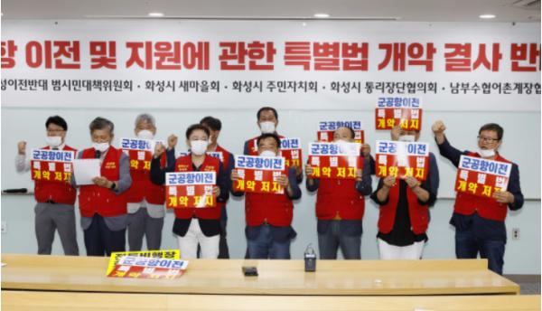 [KNT한국뉴스타임] 전투비행장 화성이전반대 범시민대책위원회(이하 범대위)·화성시 주민자치회·통리장단협의회·새마을회·남부수협어촌계협의회 등 화성시 시민단체들은 6월 24일 11시 모두누림센터 세미나실에서 ‘군공항 이전 및 지원에 관한 특별법 개정안(이하 개정안)’철회를 촉구하는 성명서를 발표했다.
