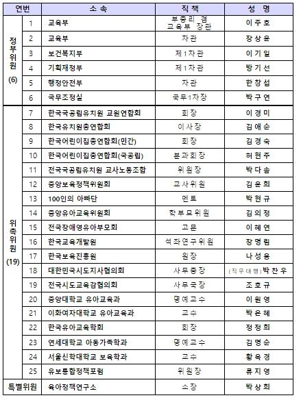 이에 따라 교육부는 부총리 겸 교육부장관을 위원장으로, 보건복지부 등 관계부처 차관급을 정부위원으로 하며, 유치원·어린이집 관련 기관단체, 교원?교사, 학부모, 학계 전문가 등을 위촉위원으로 한'영유아교육?보육통합 추진위원회'를 발족시켰다.