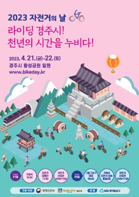 행정안전부는 올해 경주시와 공동으로 '2023 자전거의 날 행사'를 4월 21일부터 4월 22일까지 이틀간 경주시 황성공원 일대에서 개최한다고 밝혔다.