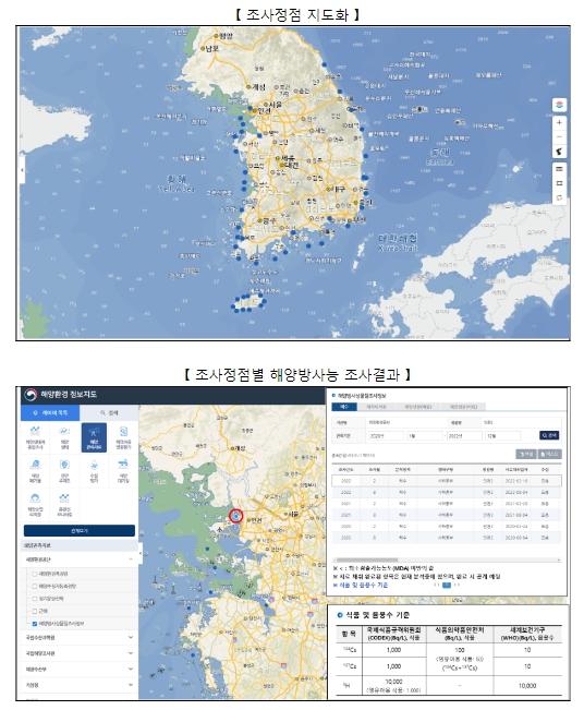 해양수산부가 수행하는 우리나라 연안해역에 대한 해양방사능 조사결과는 해양환경정보포털 누리집에서 볼 수 있으며, 이 외에 해양수산부 누리집에서도 확인할 수 있다.