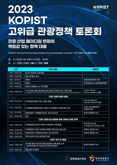 [한국뉴스타임=편집국] 문화체육관광부는 한국관광공사(사장 김장실)와 함께 4월 5일, 그랜드 하얏트 서울에서 ‘2023 코피스트(KOPIST) 고위급 관광정책 토론회(2023 KOPIST High-Level Policy Forum)’를 열어 코로나19 이후 관광산업의 변화와 각국 정부 대응 방안을 논의한다.