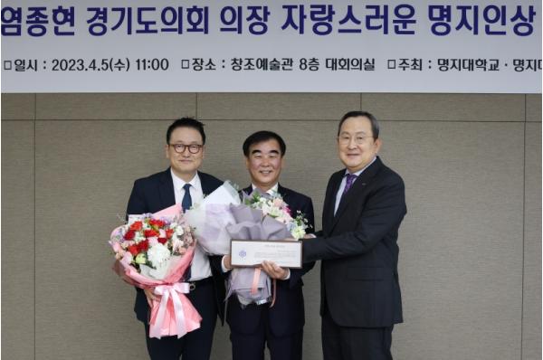 유 총장은 상패를 수여하며 “염종현 동문은 제8·9·10·11대 경기도의원을 역임하고 1,400만 도민을 대변하는 의장으로 선출되며 지역사회 발전에 이바지해 왔다”라며 “후배들에게 훌륭한 본보기가 되는 자랑스러운 명지인으로서 앞으로도 우리 사회를 바르게 이끌어주길 바란다”라고 말했다.
