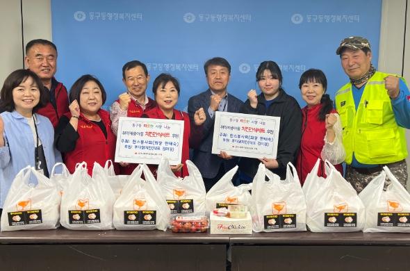 동구야 토닥토닥 치킨배달사업은 한스봉사회에서 매월 취약계층 아동?청소년과 독거노인 등 10가구에 치킨 선물세트(각종 과일 포함)를 직접 방문해 전달하는 사업이다.