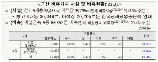 현재 보유중인 비철금속 비축재고를 국내 수입수요 기준 ‘22년말 49일분에서 ‘27년까지 60일분으로 확충하는 것을 목표로, 올해에는 신규 비축자금 5백억원을 포함한 가용 비축자금을 최대한 활용하여 비철금속 9천톤 이상 구매로 51일분까지 확보할 예정이다.