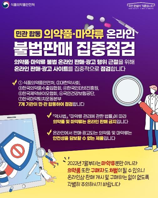 식약처는 앞으로도 폭넓은 민·관 협업을 바탕으로 한 의약품·마약류 온라인 불법유통 점검을 적극적으로 확대해 경찰효과를 극대화고 건전한 온라인 환경을 조성함으로써 소비자 피해 예방을 위해 최선을 다하겠다고 전했다.