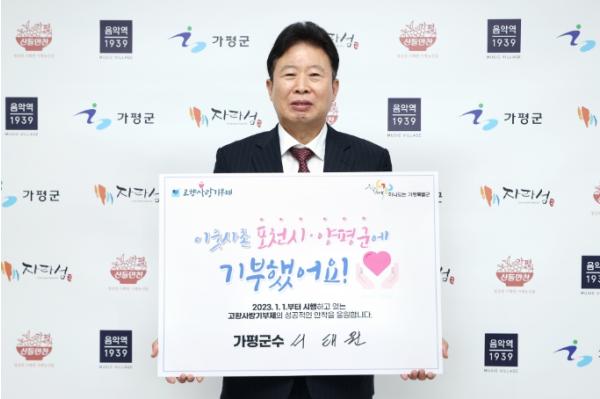[한국뉴스타임=편집국] 내 고향을 살리는 고향사랑기부제의 성공적인 안착과 기부문화 확산을 위해 서태원 가평군수가 6일 고향사랑기부 인증 챌린지에 동참했다.