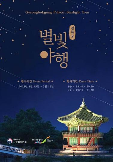 [한국뉴스타임=편집국] 문화재청 궁능유적본부(본부장 정성조)는 한국문화재재단(이사장 최영창)과 함께'2023 경복궁 별빛야행' 상반기 행사를 4월 15일부터 5월 13일까지 20일간 하루 2회씩 진행하기로 하고, 오는 7일 오후 2시부터 온라인 입장권 예매를 시작한다.