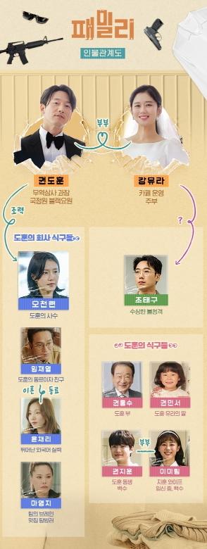 이 가운데 ‘패밀리’의 인물관계도가 공개돼 예비 시청자들의 흥미를 고조시킨다. 공개된 인물관계도에는 권도훈(장혁 분), 강유라(장나라 분) 부부를 중심으로 집 안팎 인물들의 관계가 일목요연하게 담겨있어 관심을 집중시킨다.
