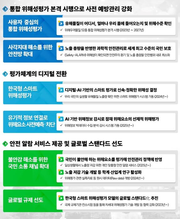 유해물질을 입력하면 인공지능(AI) 기반의 시스템이 한국인의 생활패턴을 고려한 위해평가 모델을 자동으로 설계해 유해물질 노출량을 계산하고 위해성에 대한 평가결과를 도출하여 신속?정확한 평가가 가능해진다. 또한, 영유아?만성질환자 등 인구집단별로 노출되는 유해물질의 양을 확인하기 위해 섭취량?생활습관 등 실생활 데이터를 확보해 디지털화한다.
