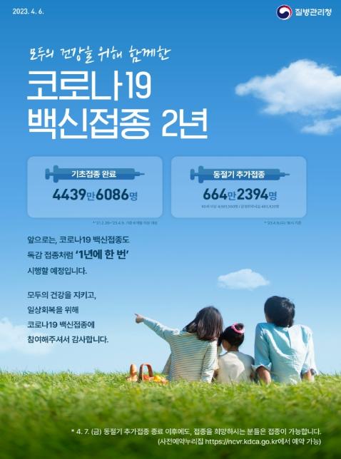 추진단은 “동절기 추가접종기간 종료 후에도, 접종을 미처 완료하지 못한 분들(1·2차, 2가백신)을 위해 접종유지기관을 선정하여 운영한다”며, “백신접종은 고령층 등 고위험군을 보호할 수 있는 가장 효과적인 방법이므로, 미접종자는 4월 7일 이후에도 접종유지기관을 확인하여 접종에 참여해주시기 바란다”고 밝혔다.