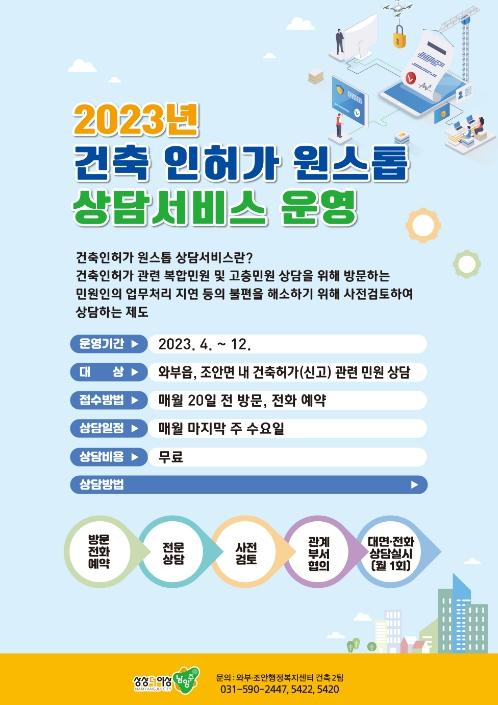 [한국뉴스타임=편집국] 남양주시 와부조안행정복지센터는 2023년 특화 시책으로 올해 4월부터 12월까지 ‘건축 인허가 원스톱 상담서비스’를 운영한다고 6일 밝혔다.