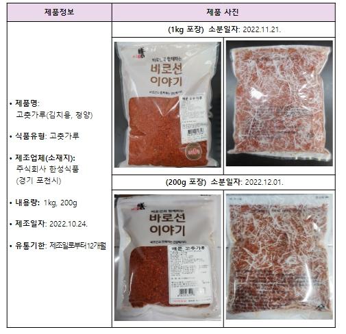 [한국뉴스타임=편집국] 식품의약품안전처는 식품소분업체인 ‘주식회사 한성식품(경기 포천시 소재)’이 소분?판매한 ‘고추가루(김치용, 청양)(식품유형: 고춧가루)’가 식중독균인 클로스트리디움 퍼프린젠스 기준 부적합으로 확인되어 해당 제품을 판매 중단하고 회수 조치한다.