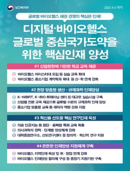 보건복지부는 4월 6일 제20회 국정현안관계장관회의에서 관계부처 합동으로 마련한 '바이오헬스 인재양성 방안'을 발표했다.