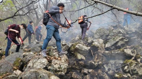 산불 발생 현장에는 1일 차에 17대, 2일 차에 20대의 헬기가 각각 동원됐으며, 2일간 공무원, 산림청 특수진화대·공중진화대, 산불전문예방진화대, 소방대원, 군인 등 878명의 인력이 투입됐다.