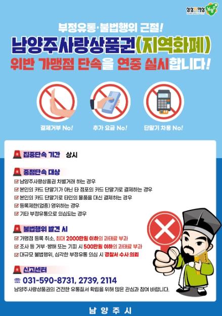 시 관계자는 “남양주사랑상품권(지역화폐)의 부정유통을 근절하기 위해 집중 홍보와 상시 모니터링을 통한 특별 단속을 추진하겠다.”라며 “이번 일제 단속을 비롯해 앞으로도 올바른 유통 질서 확립으로 골목 상권의 지역 경제 활성화에 기여할 수 있도록 최선을 다하겠다.”라고 밝혔다.