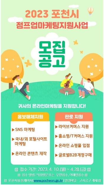 2023년 포천시 기업 (JUMP UP↗) 마케팅 지원사업은 관내 중소기업의 경쟁력을 강화하고 매출 신장을 촉진하는 보다 적극적인 마케팅 사업을 추진하고자 마련됐다. 소비자의 온라인 구매 및 기업의 마케팅 니즈에 맞춰 SNS 및 포털사이트 홍보, 라이브 방송 지원 등 디지털 시장을 타겟으로 하는 마케팅 지원 사업이다.