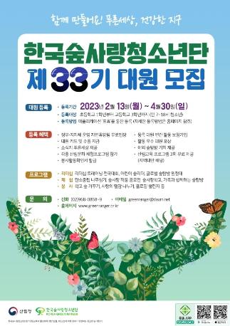 [한국뉴스타임=편집국] 산림청은 오는 4월 30일까지 ‘제33기 한국숲사랑청소년단’ 대원 모집기간을 연장한다고 밝혔다.