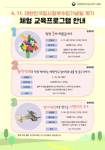 국가보훈처는 “임시정부수립 기념일의 의미와 가치를 만들기 체험을 통해 되새기고 선열들에게 감사의 마음을 전할 수 있도록, 학생과 일반시민 등 총 1,300명을 대상으로 하는 '만들기 체험교실'을 오는 11일(화)과 13일(목), 14일(금) 등 세 차례에 걸쳐 임시정부기념관 의정원홀에서 운영한다”고 7일 밝혔다.